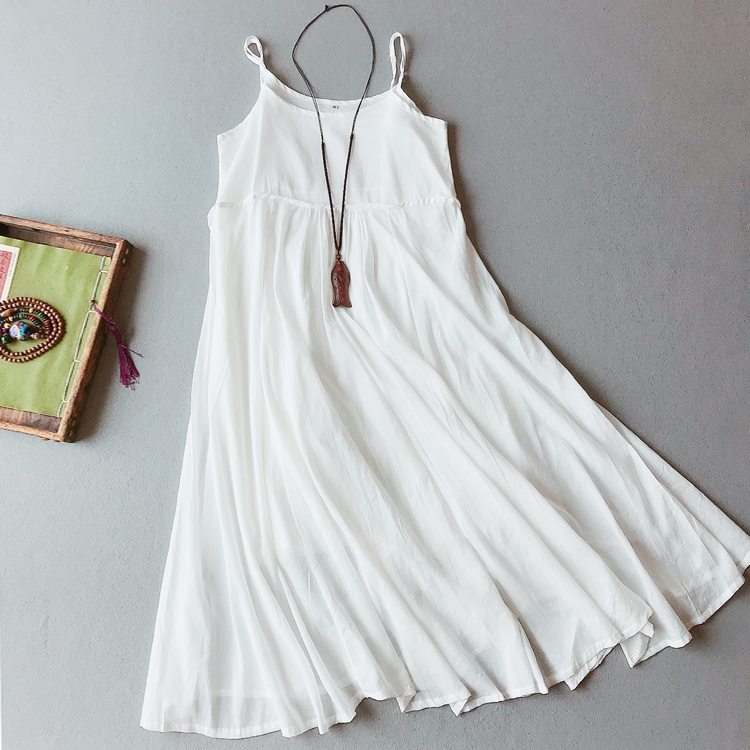 2020春夏新款棉麻女装文艺双层棉宽松白色打底中长款吊带连衣裙子