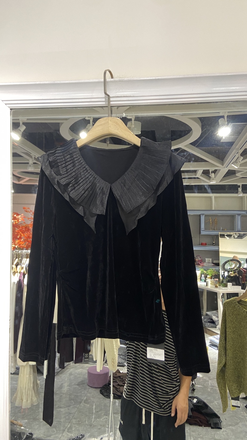 胖妹妹圆领拼接蕾丝荷叶边长袖丝绒上衣韩版秋冬款复古风百搭大衫
