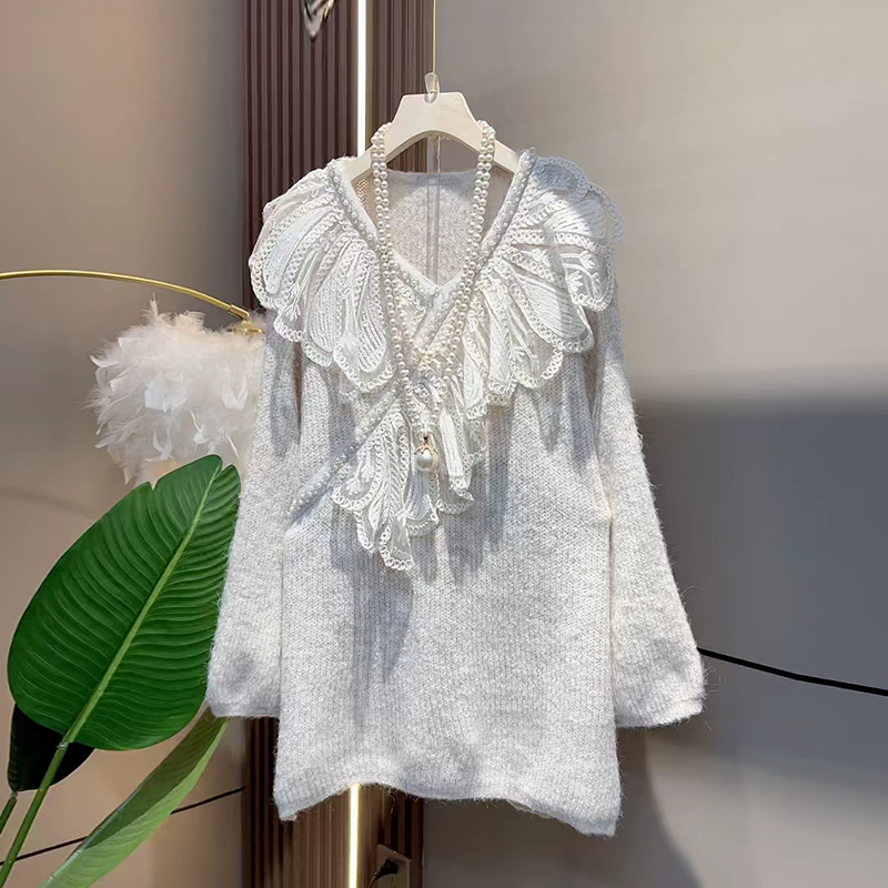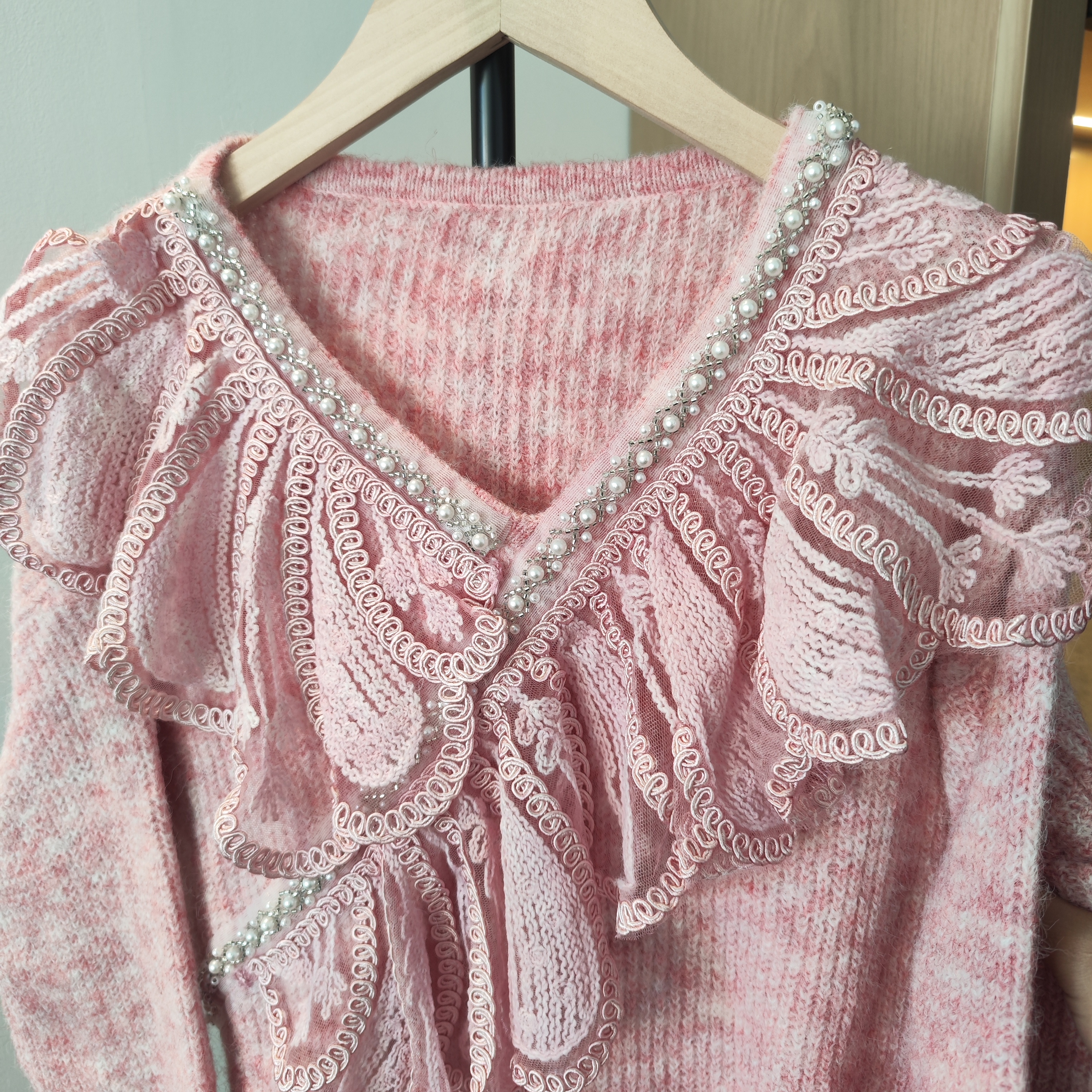时尚荷叶边V领针织衫女2025秋冬小香风宽松百搭显瘦长袖亮丝毛衣