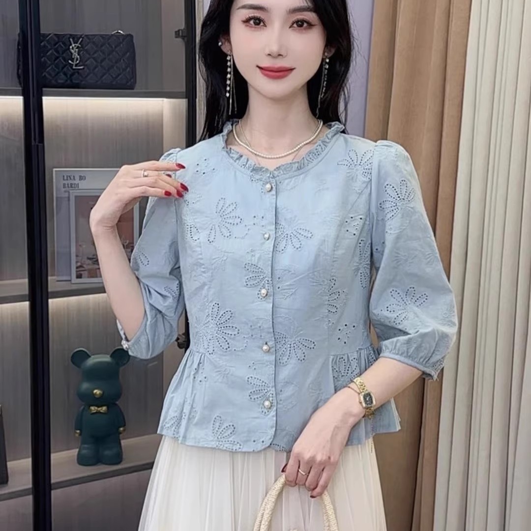 新中式国风重工刺绣棉麻衬衫女装夏季轻薄五分袖漂亮减龄棉麻上衣