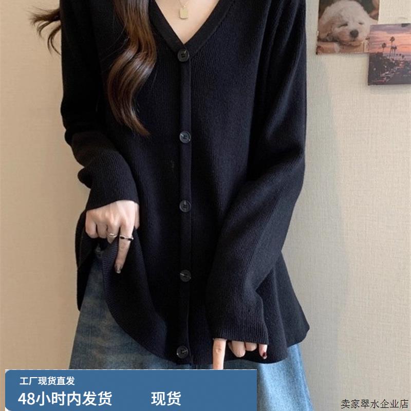 大码设计感v领黑色长袖针织衫女秋季胖妹妹中长款内搭打底衫上衣