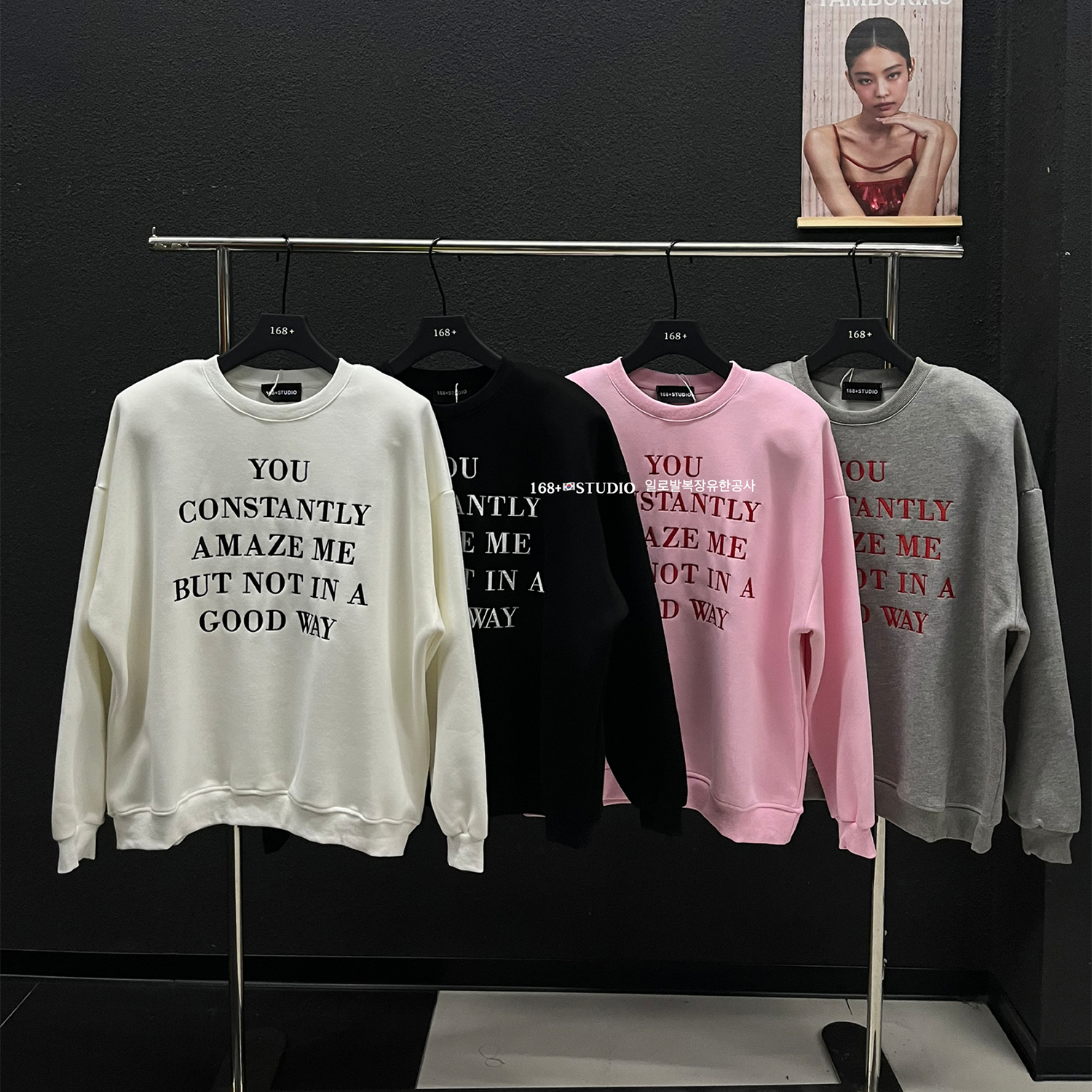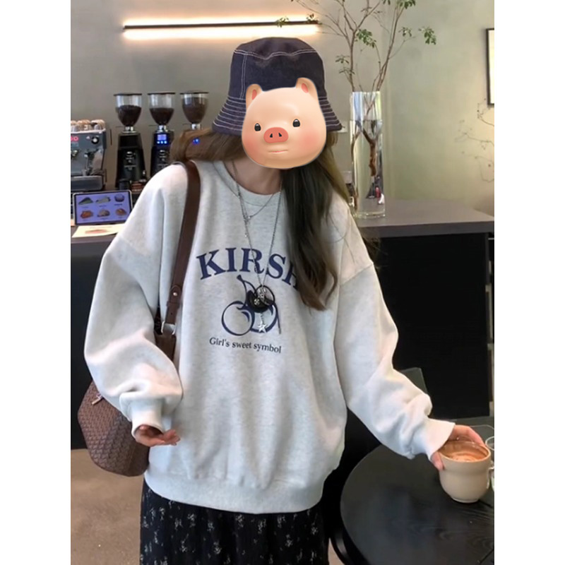 圆领美式字母印花卫衣女秋冬新款宽松韩版加绒加厚无帽大码上衣潮