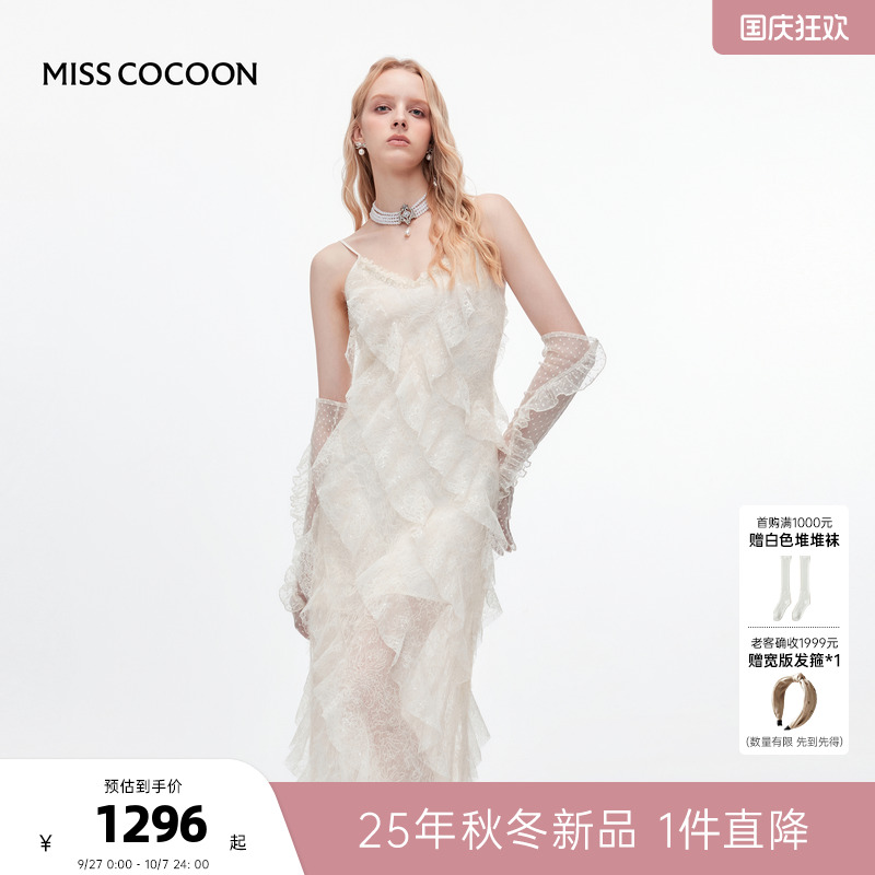 MISSCOCOON可可尼白色吊带裙女2025秋冬新款V领蕾丝荷叶边连衣裙