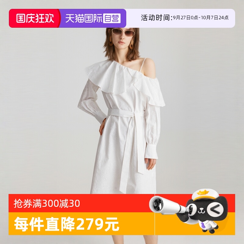 【自营】ELLE白色荷叶边提花露肩系带连衣裙女2024冬新款气质裙子
