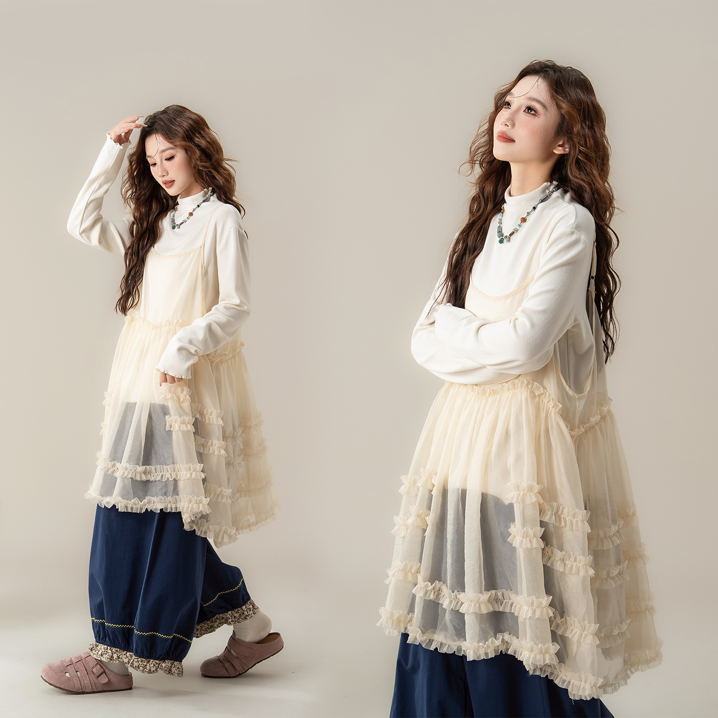 白色高领连衣裙女秋冬款长袖气质荷叶边中长裙收腰褶皱内搭长裙