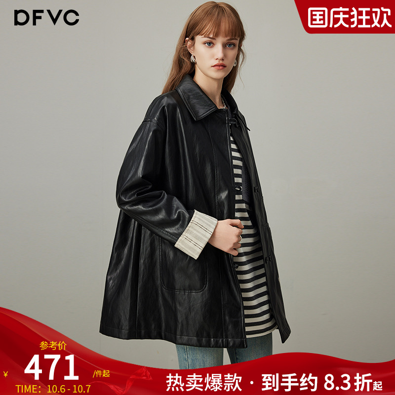 dfvc复古黑色中长款皮衣外套女2025年秋季新款拼接高级感宽松夹克