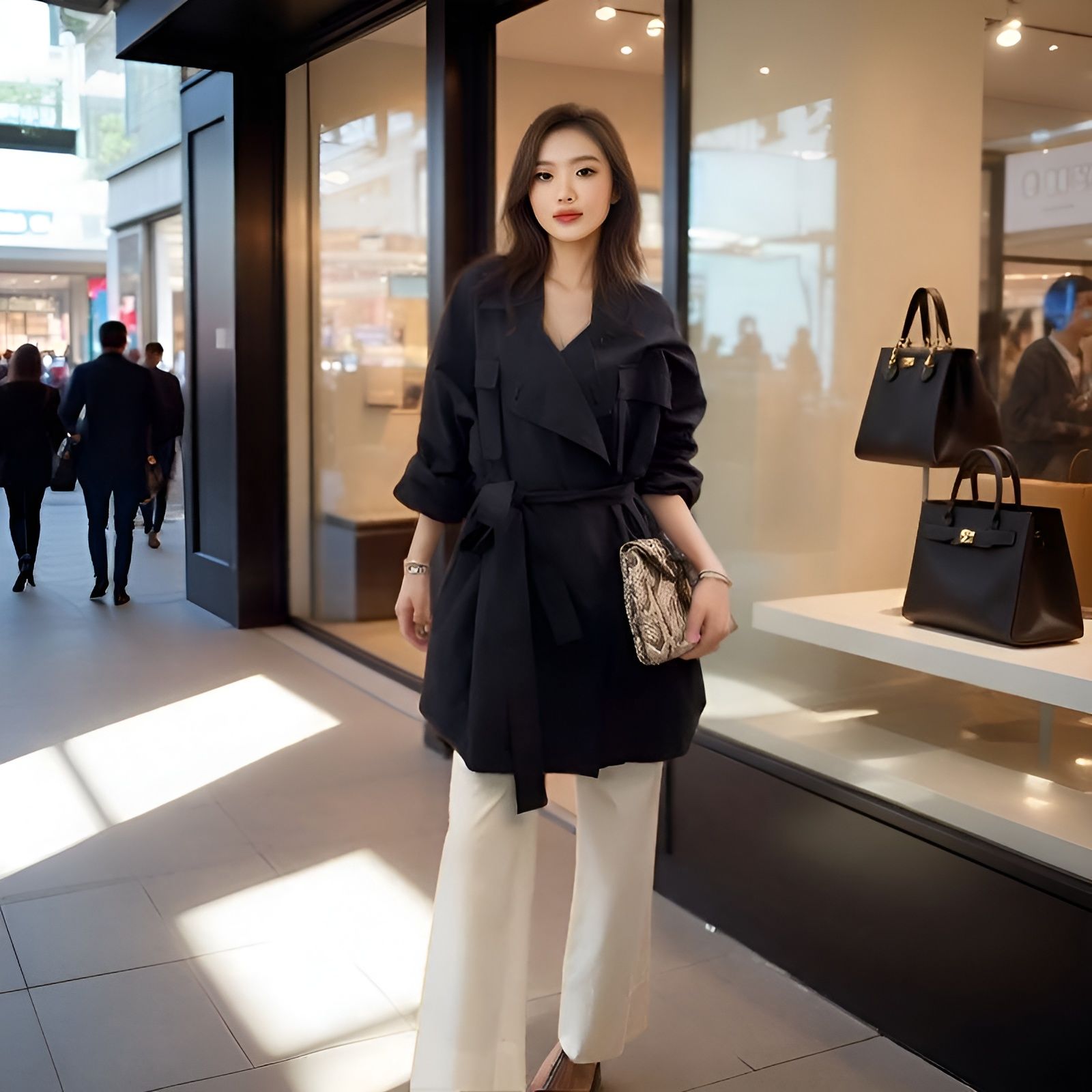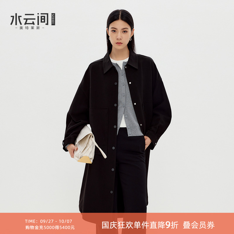 水云间黑色衬衫领休闲廓形风衣女中长款外套宽松气质都市感2025秋