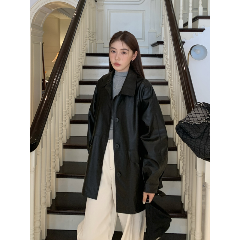 Halo Luu 黑色翻领皮衣外套女秋季2025新款宽松高级感中长款夹克