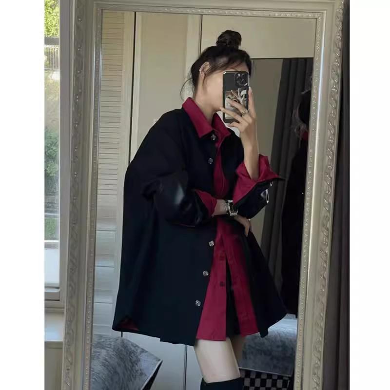 春秋新款两件套女穿搭小众设计感黑色外套+酒红色衬衫宽松中长款
