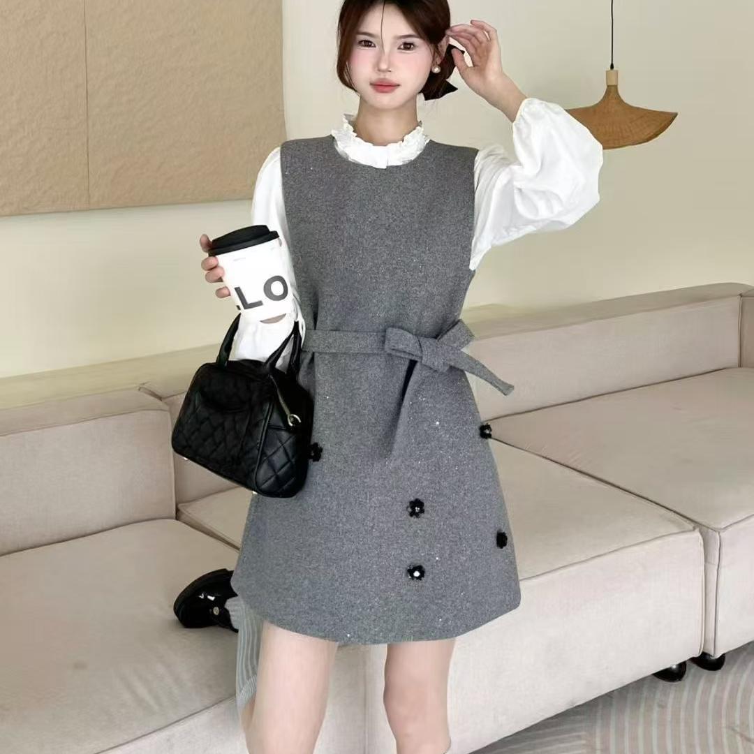 2025春季新款韩系复古条纹毛呢背心连衣裙+蕾丝花边衬衫时尚套装