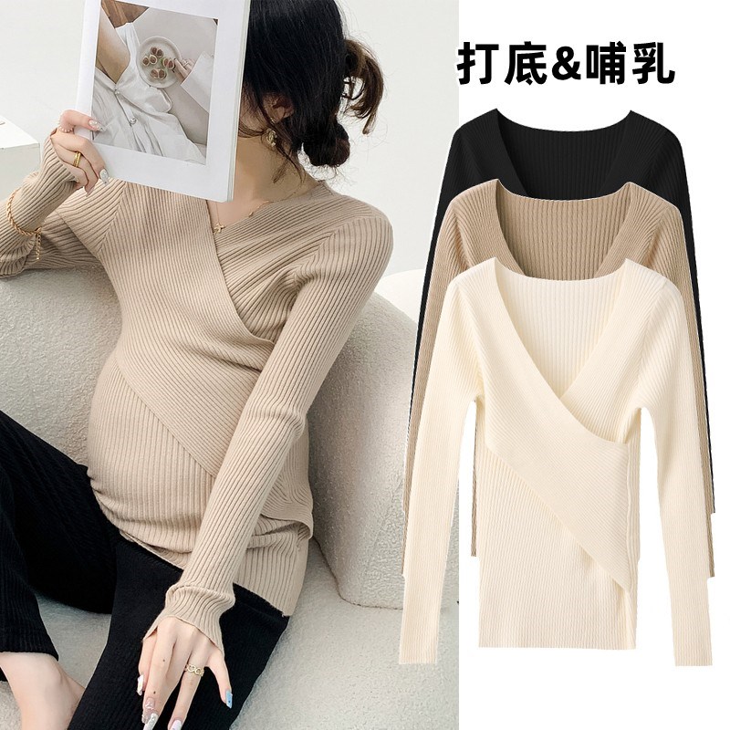 哺乳衣外出辣妈款上衣春秋款羊毛衫秋冬季产后打底衫喂奶毛衣春装