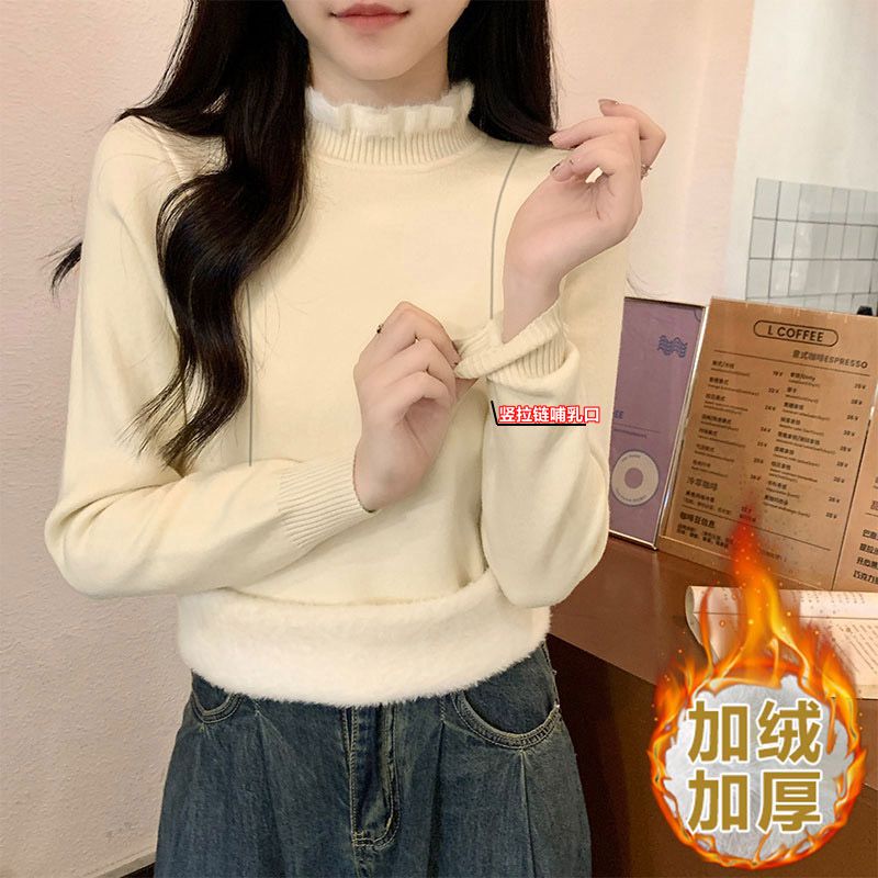 哺乳上衣冬季一体绒保暖半高领针织毛衣产后辣妈款外出喂奶打底衫