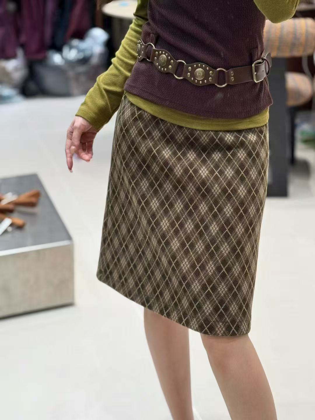 菱形格子毛呢半身裙女秋冬2025新款复古中长款高腰显瘦包臀a字裙