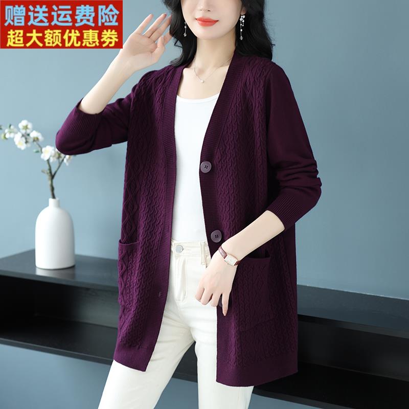 中年妈妈春秋装羊毛针织开衫女中长款宽松特大码纯色外搭毛衣外套