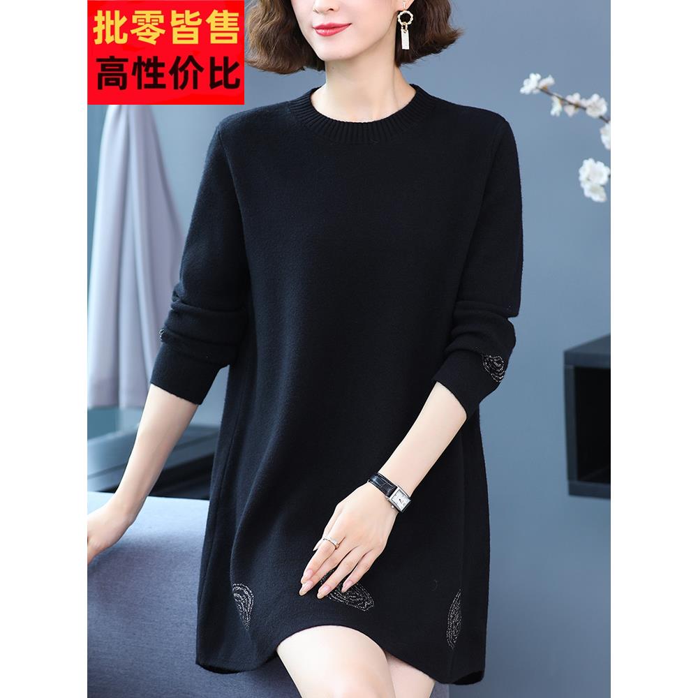 圆领羊毛毛衣女中年妈妈秋冬季新款洋气宽松中长款大码打底羊毛衫