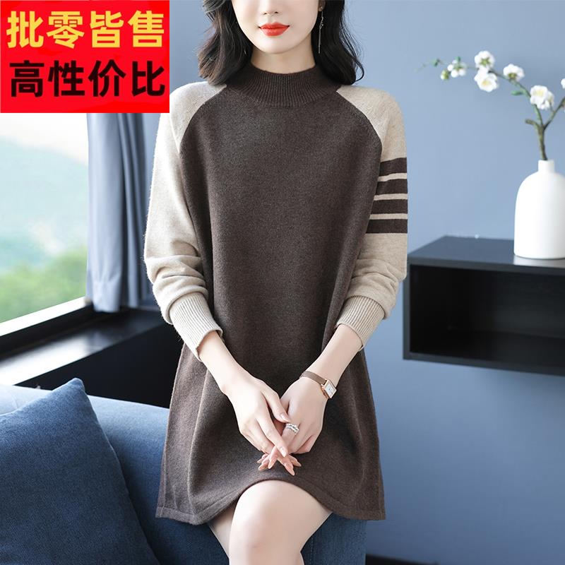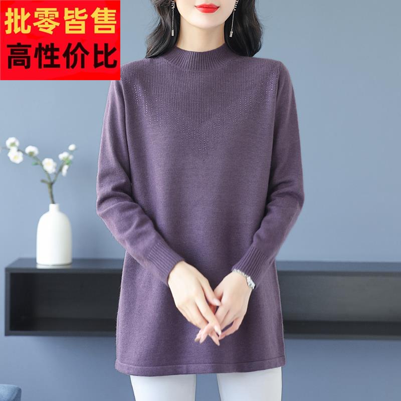 2025半高领针织衫女宽松毛衣中年妈妈中长款羊毛秋冬加厚打底上衣