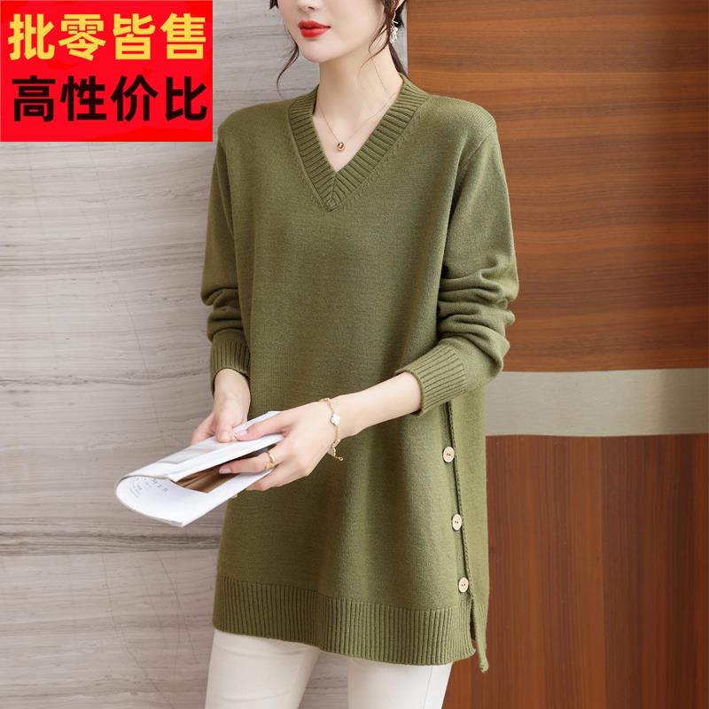 中年妈妈秋冬羊毛衫中长款V领毛衣女宽松加肥大码洋气针织打底裙