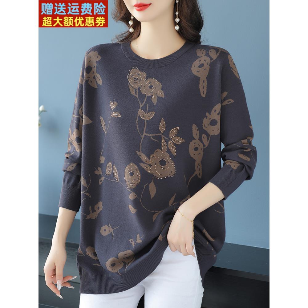 中年妈妈春秋宽松毛衣女中长款加肥加大码洋气印花羊毛针织打底衫