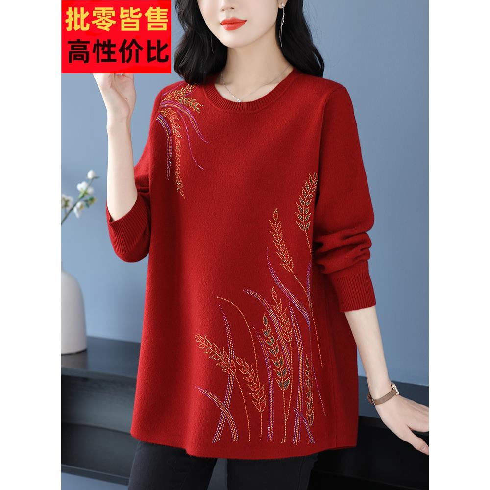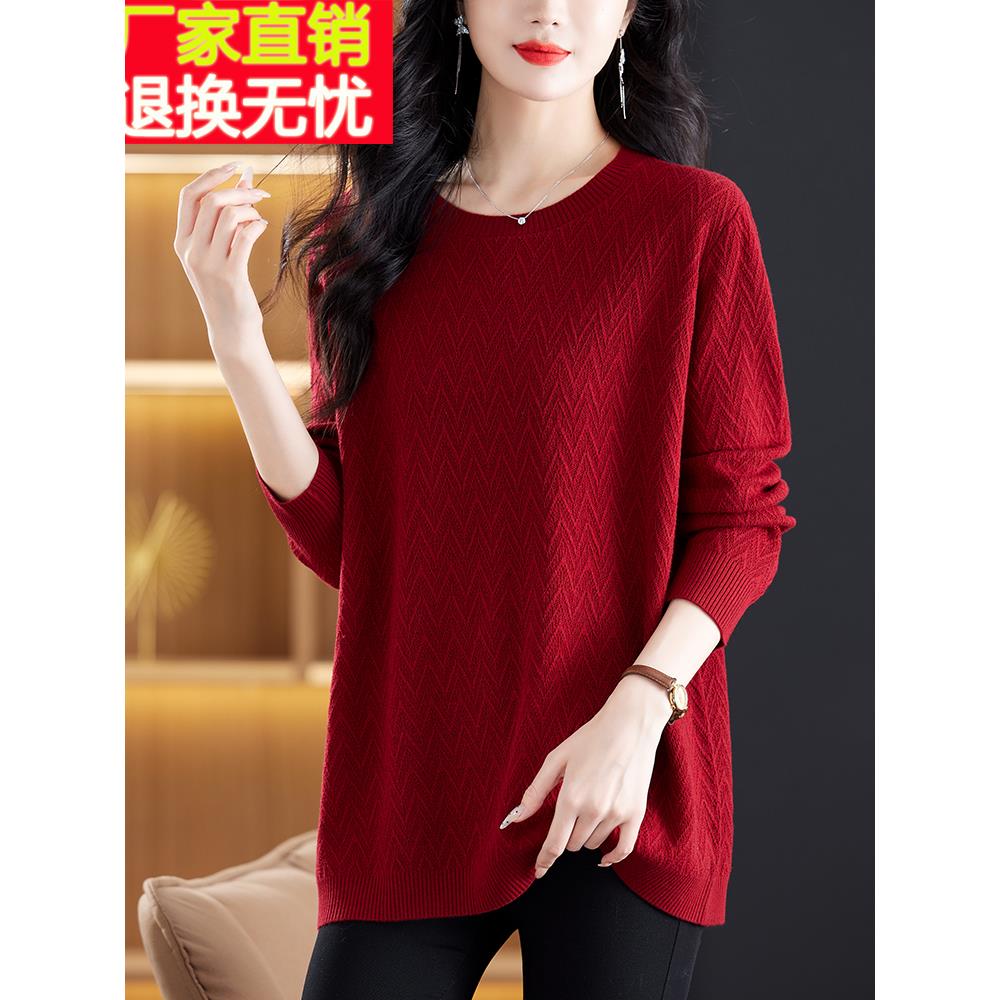 中年妈妈羊毛衫女内搭毛衣裙秋冬宽松加大码中长款遮肚红色打底衫