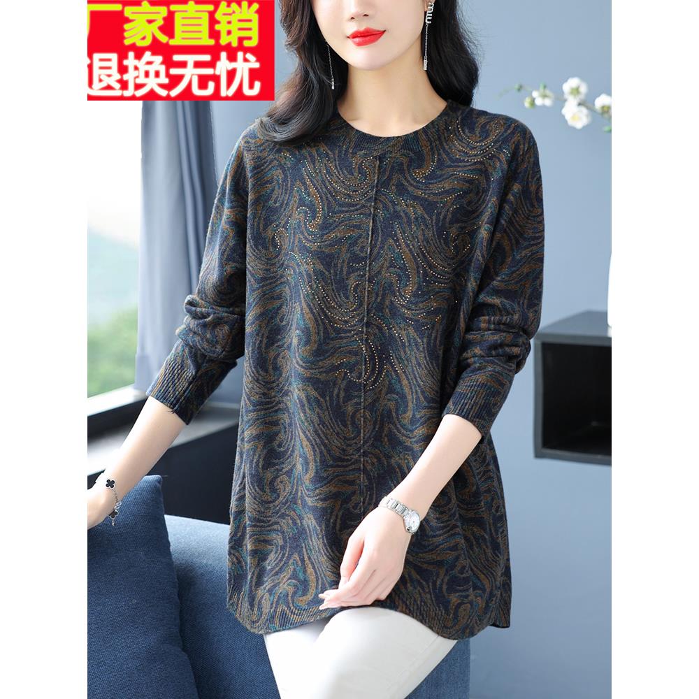 中年妈妈秋冬新款羊毛衫中长款毛衣女宽松显瘦气质印花针织打底衫