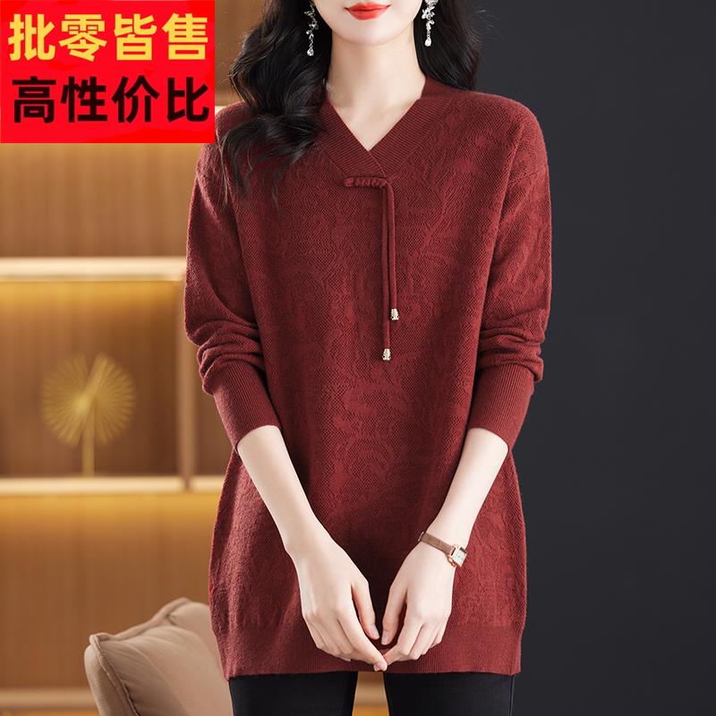 中年妈妈v领羊毛针织衫女秋季国风打底衫大码200斤遮肉中长款上衣