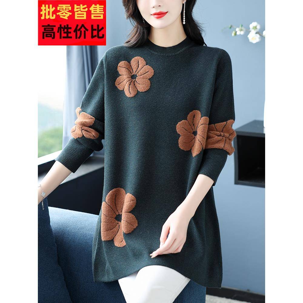 中年妈妈外穿羊毛衫女秋冬中长款大码印花毛衣宽松遮肚针织打底衫