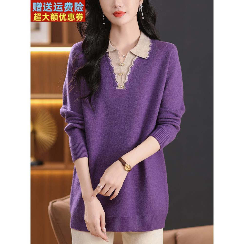 中年妈妈中长款羊毛衫秋冬女性时尚翻领毛衣宽松大码包腹针织底衫