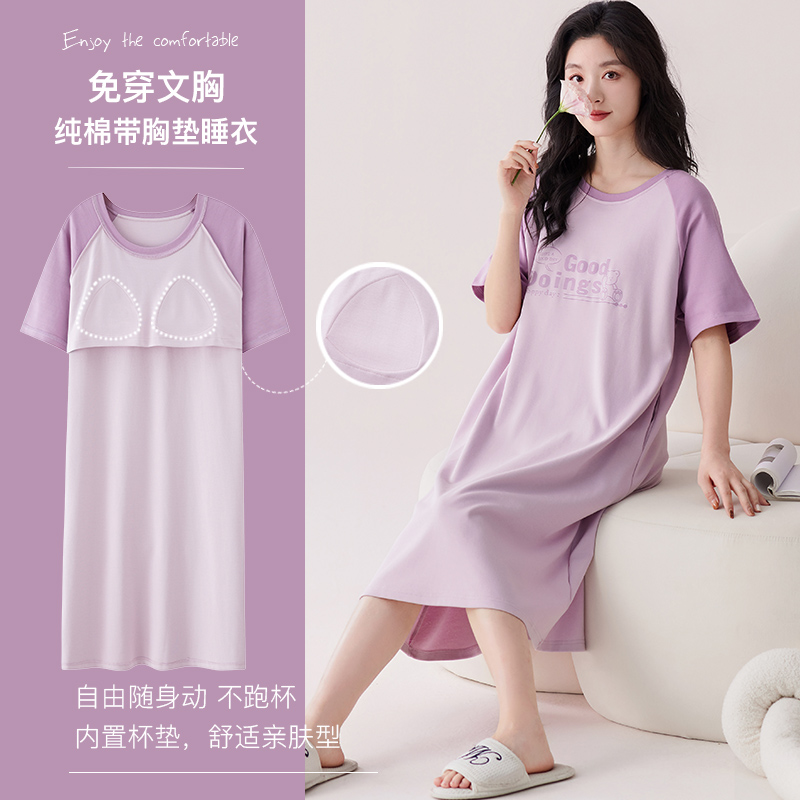 浪莎睡裙女夏季纯棉可爱韩版甜美短袖睡衣薄款中裙可外穿春秋天
