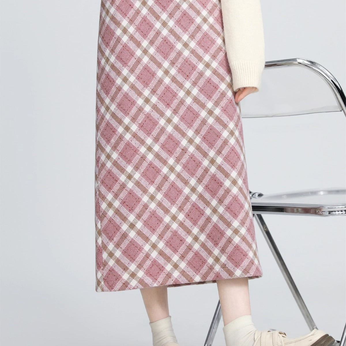 大码粉色毛呢格子半身裙女秋冬高腰a字呢子半裙后开叉中长包臀裙