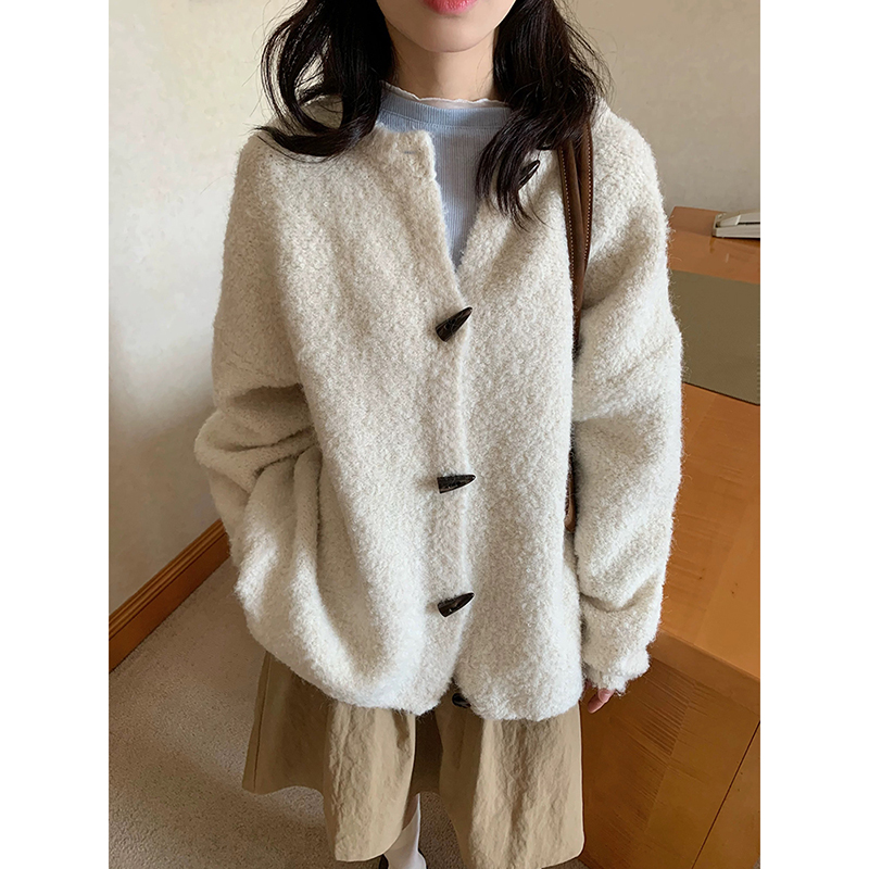 软糯小羊可爱牛角扣毛衣日系小个子米白色甜美加厚学院风外套女