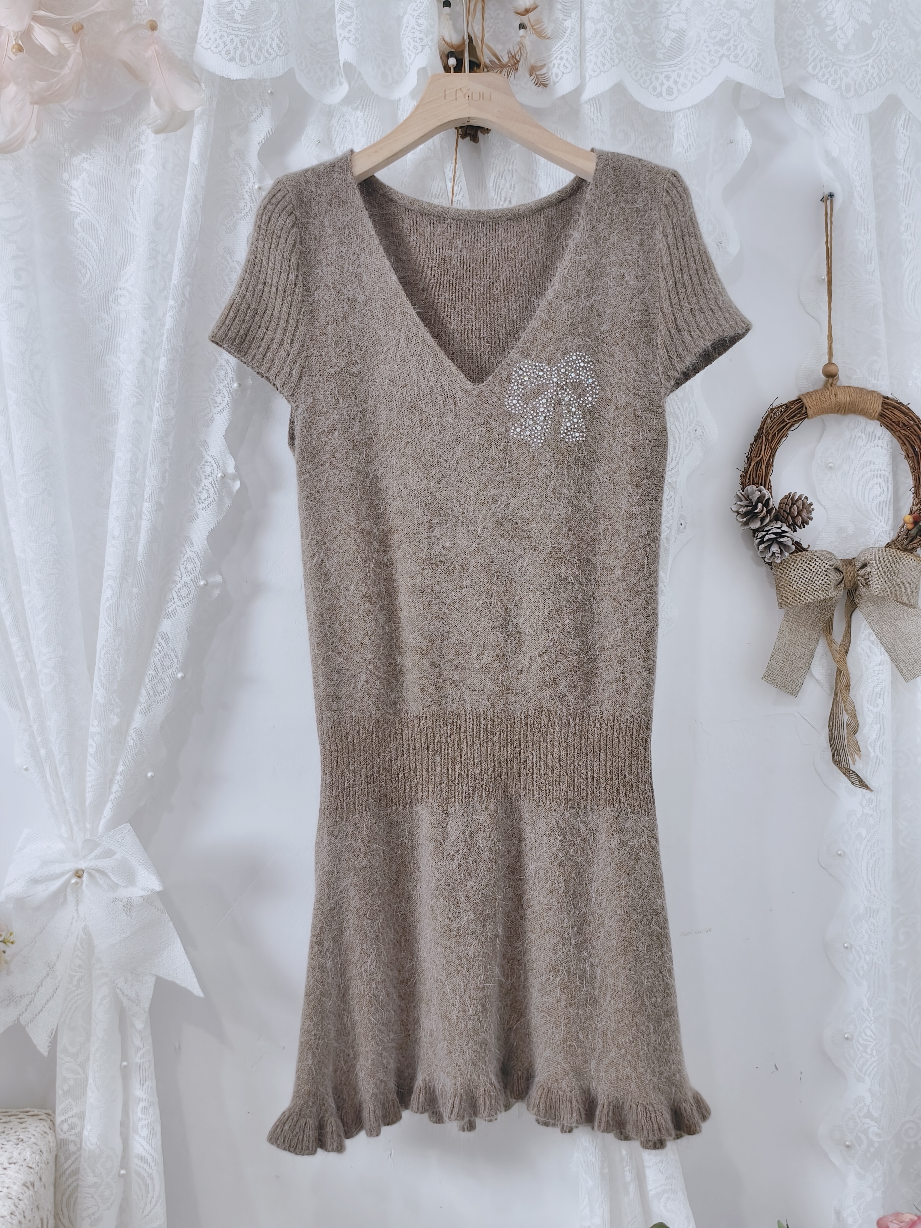 娃娃领毛衣女秋慵懒可爱甜美蕾丝V领针织开衫外套日系温柔上衣