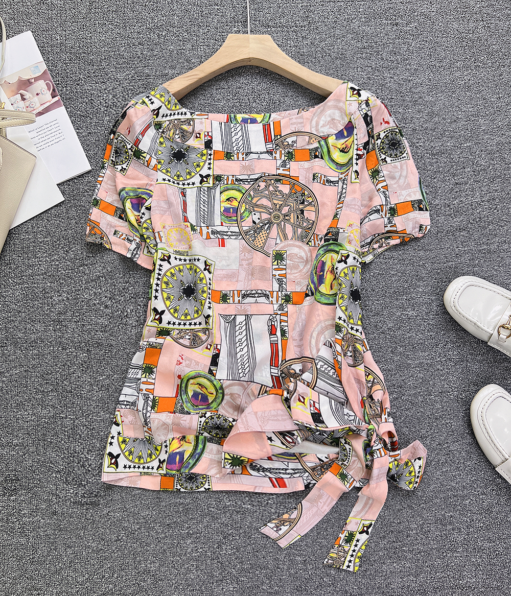 欧洲站新款真丝印花圆领短袖上衣 桑蚕丝女款T恤衫宽松休闲