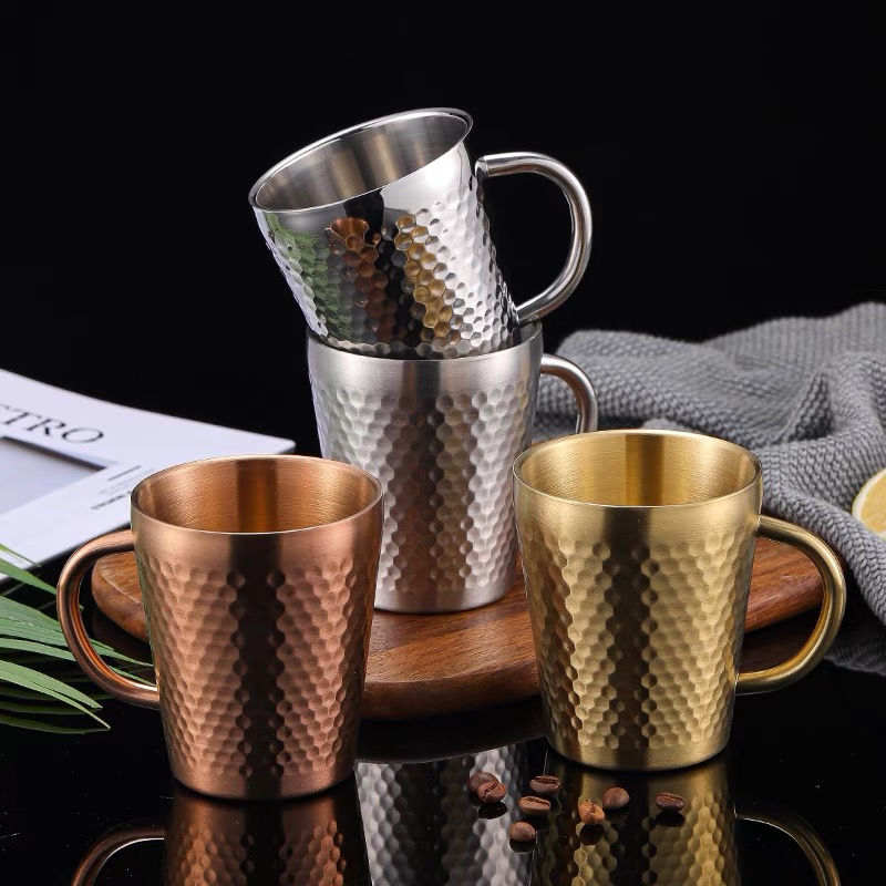 刻字304不锈钢双层啤酒杯带手柄冷饮杯韩式杯子金色水杯茶饮料杯