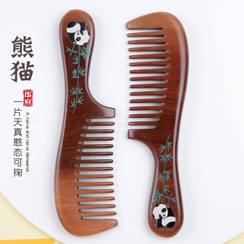 郎府老桃木梳子漆艺彩绘梳粗齿顺发卷发按摩梳手柄熊猫男女士儿童