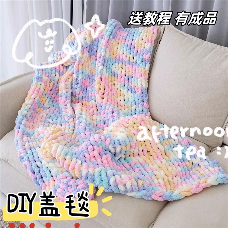 彩虹毛毯diy手工编织毛线毯子成品大球球盖毯猫尾巴雪尼尔粗线女