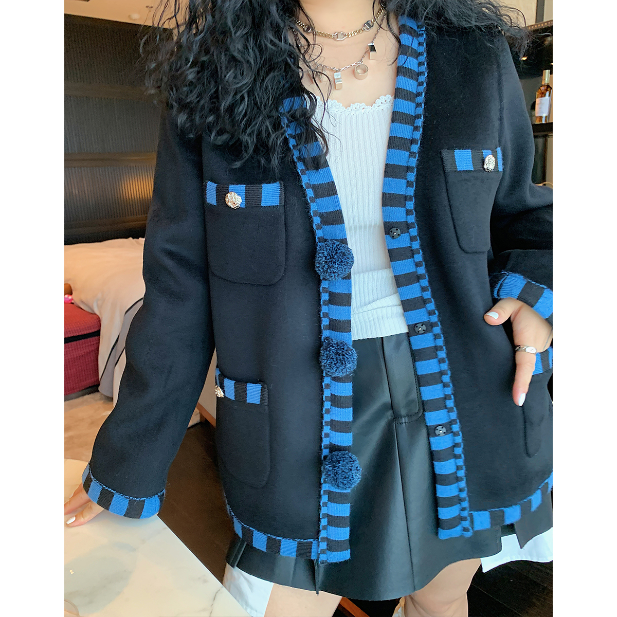 CZ2629 蝴蝶结吊坠撞色花袖口球球单排扣立领休闲羊毛呢短外套秋