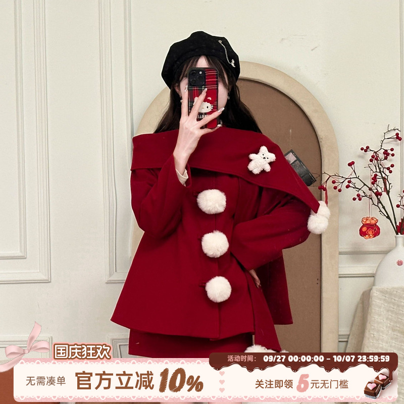 织物猪 球球芝士 新年红色斗篷毛呢套装女冬季加厚保暖外套两件套