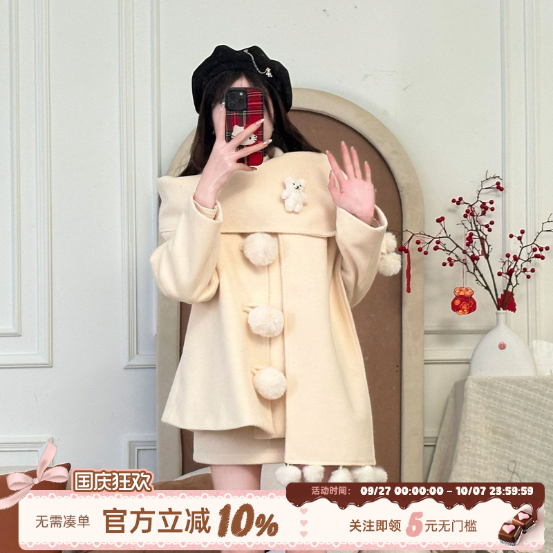 织物猪 球球芝士 新年秋冬米黄色毛呢外套女小个子可爱甜美风套装