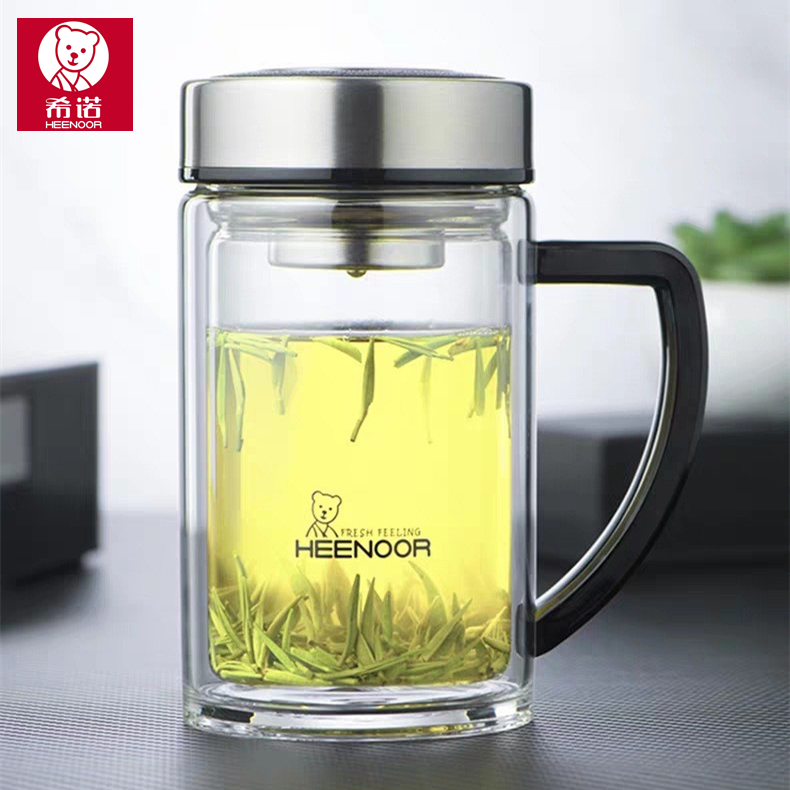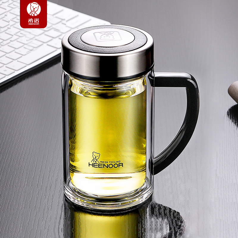 希诺双层玻璃杯带盖把手柄高档商务办公室泡茶过滤耐热透明水杯子