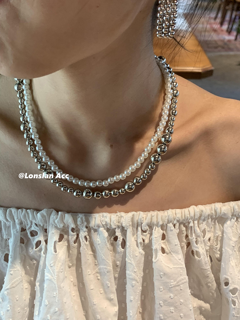LONSLAN ACC简约小众设计感珍珠金属球球缠绕双层项链