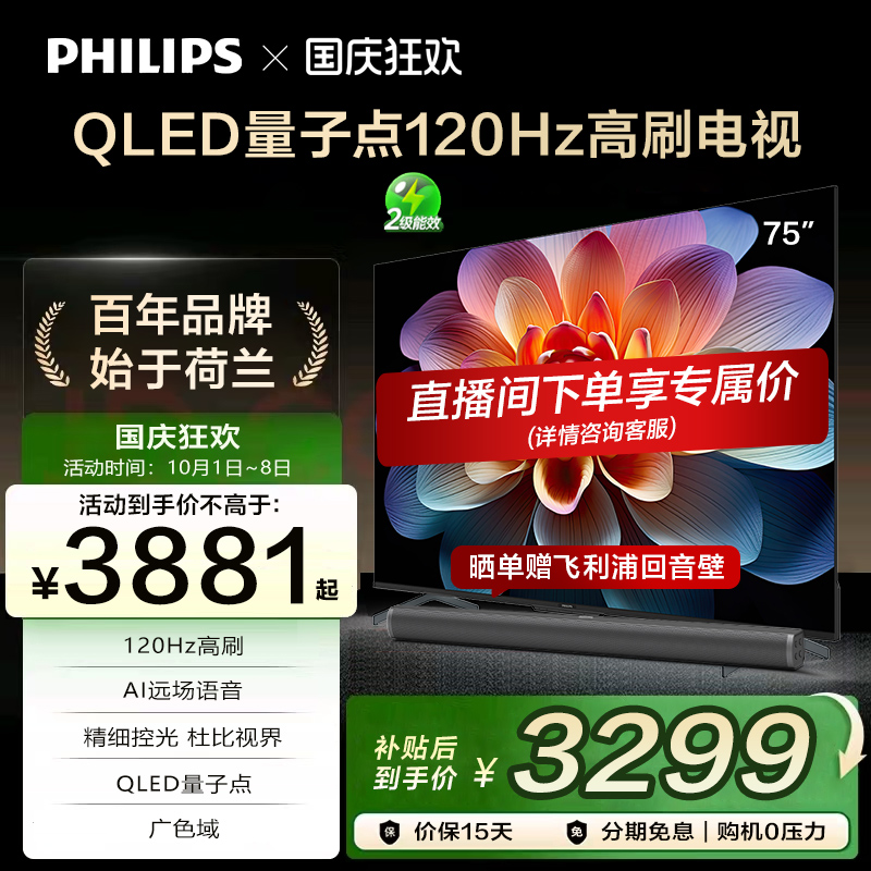 飞利浦 75英寸120HZ量子点4K全面屏大内存游戏电视机75PQF8599 65