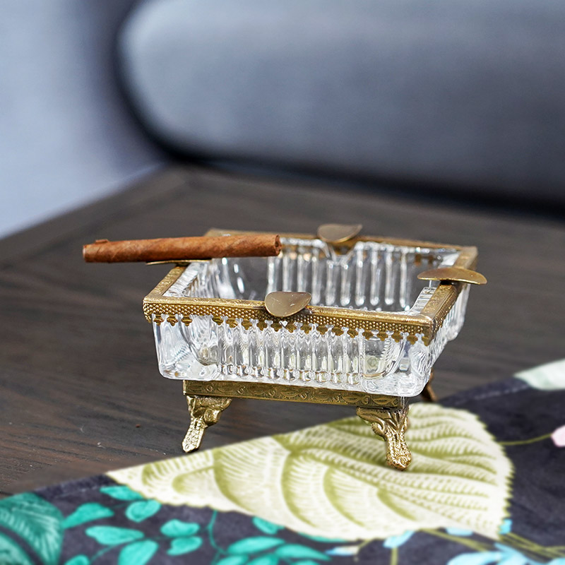 进口 黄铜雕花边玻璃烟灰缸方形四边可放烟奢华欧式美式客厅摆件