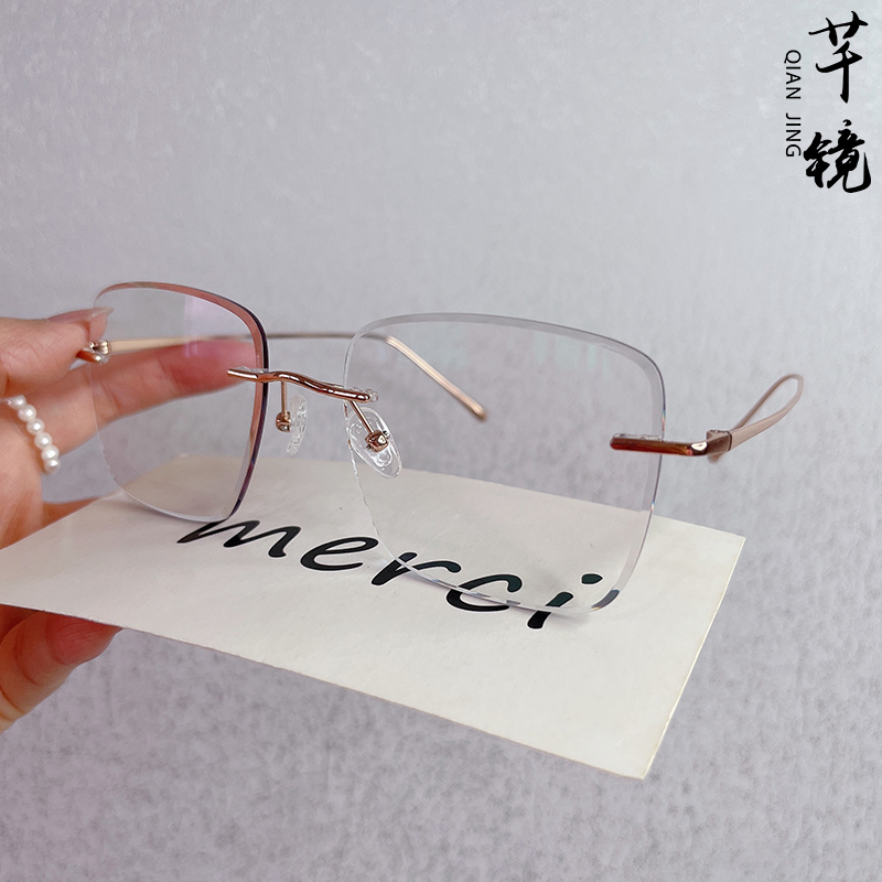 超轻切边无边框眼镜近视女可配有度数素颜显瘦粉色镜片无框眼睛架