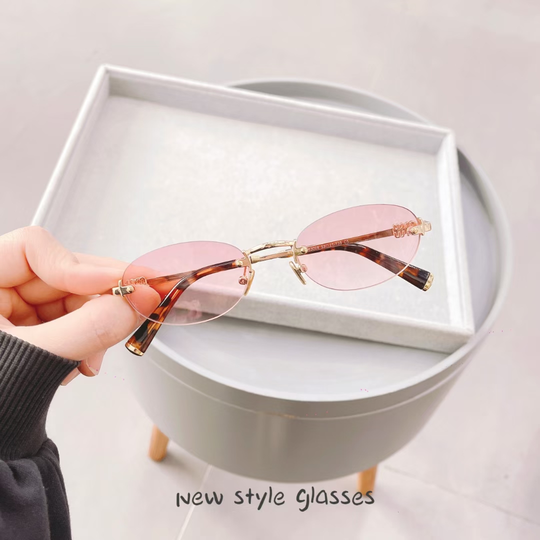 复古无框茶粉色Y2K欧美辣妹墨镜防紫外线街拍时髦太阳眼镜小窄框