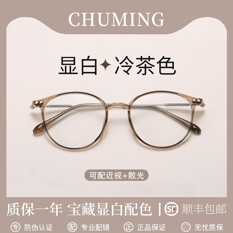 超轻钛材高级感冷茶色眼镜女近视可配度数气质显白大框圆脸眼睛架
