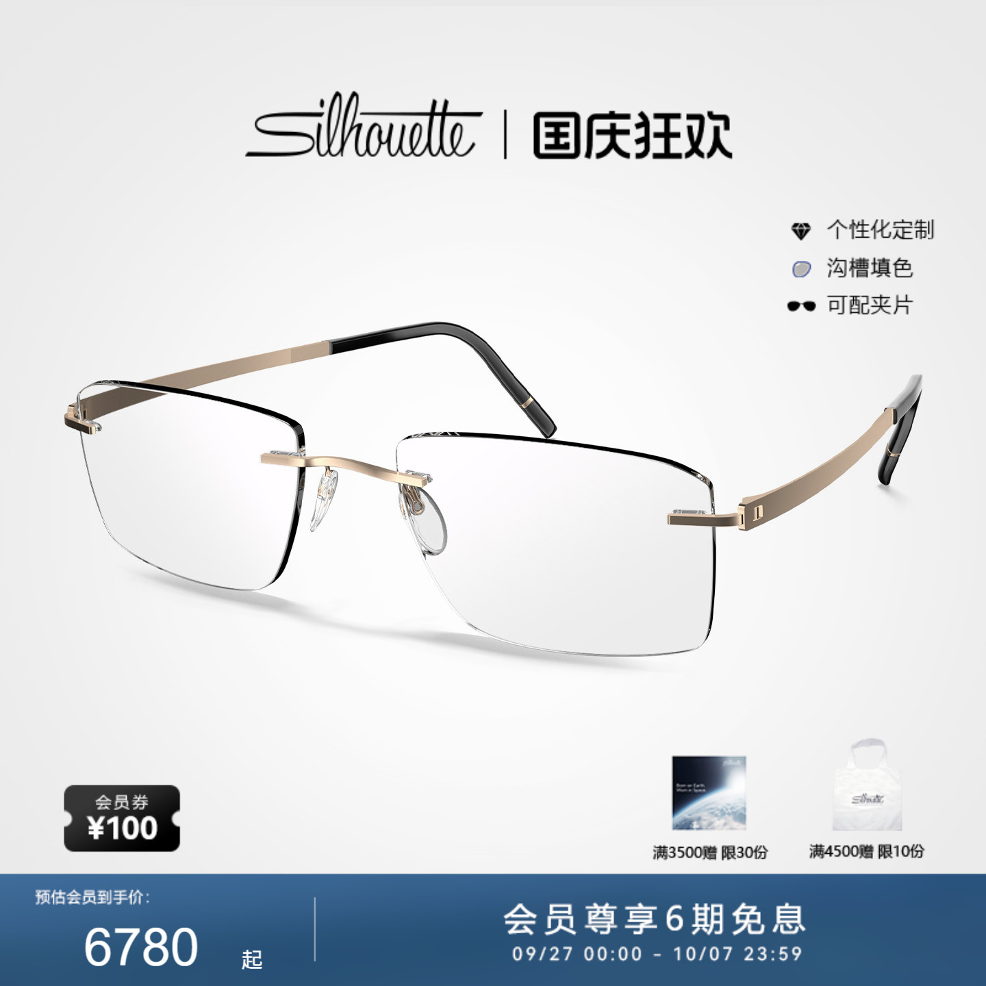 Silhouette诗乐眼镜架镀金无框眼镜框男可配度数近视眼镜女L009