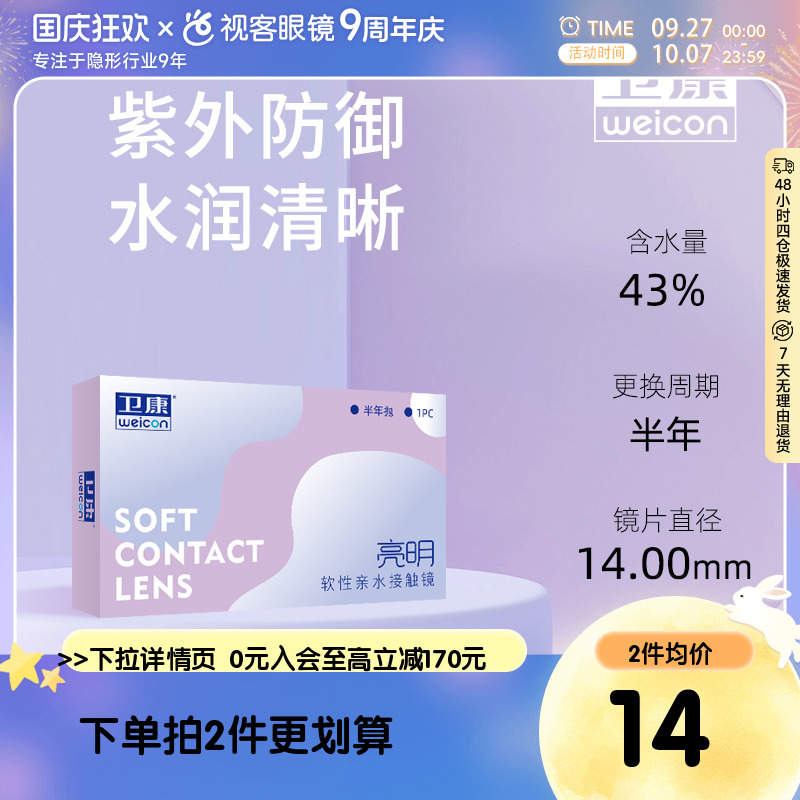 卫康亮明隐形近视眼镜2片装年抛透明水凝胶旗舰店正品平价舒适