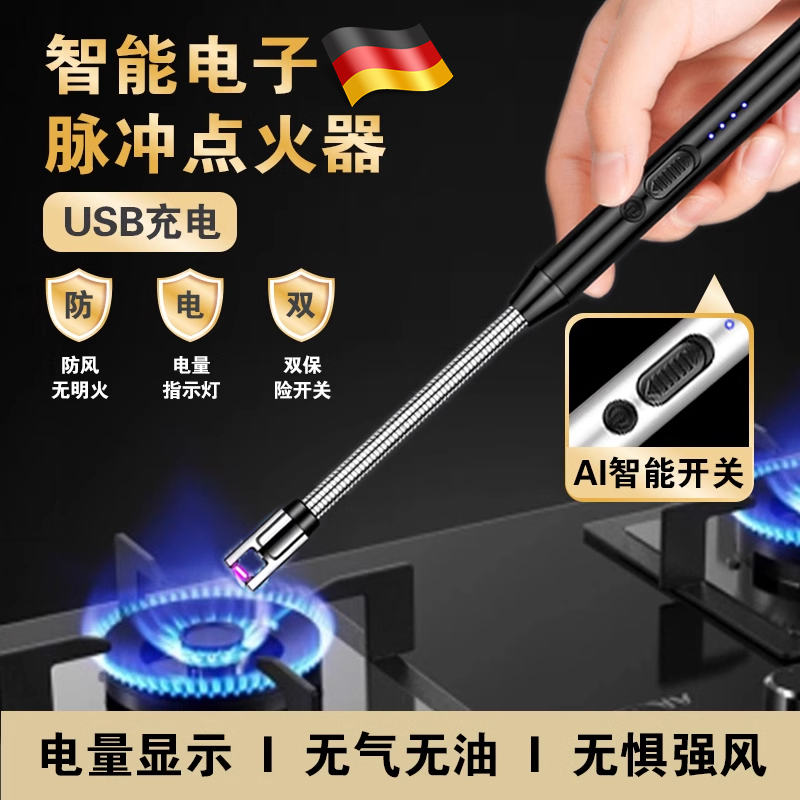 智能脉冲电弧厨房专用点火枪加长款防风打火机USB充电耐用款