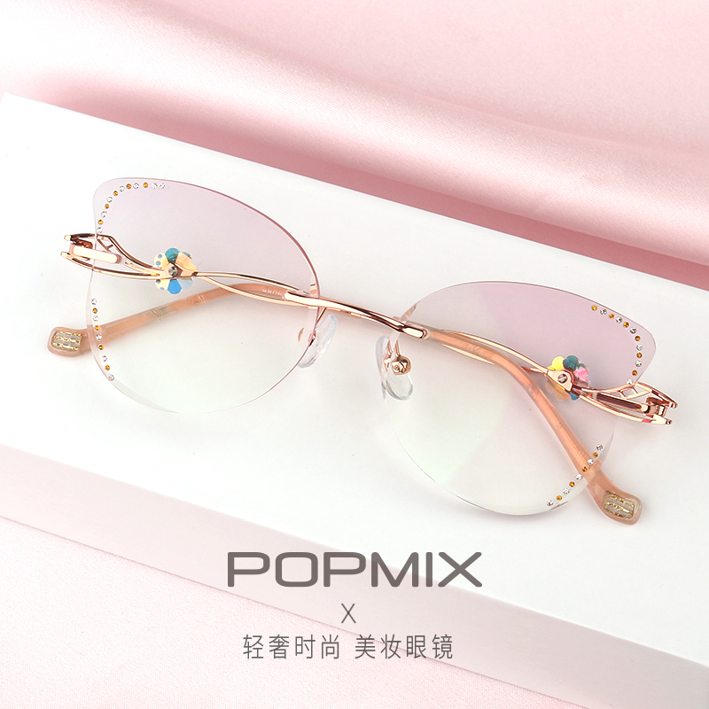 配韩国防蓝光钻石切边眼镜女无框眼镜架超轻变色近视远视平光成品