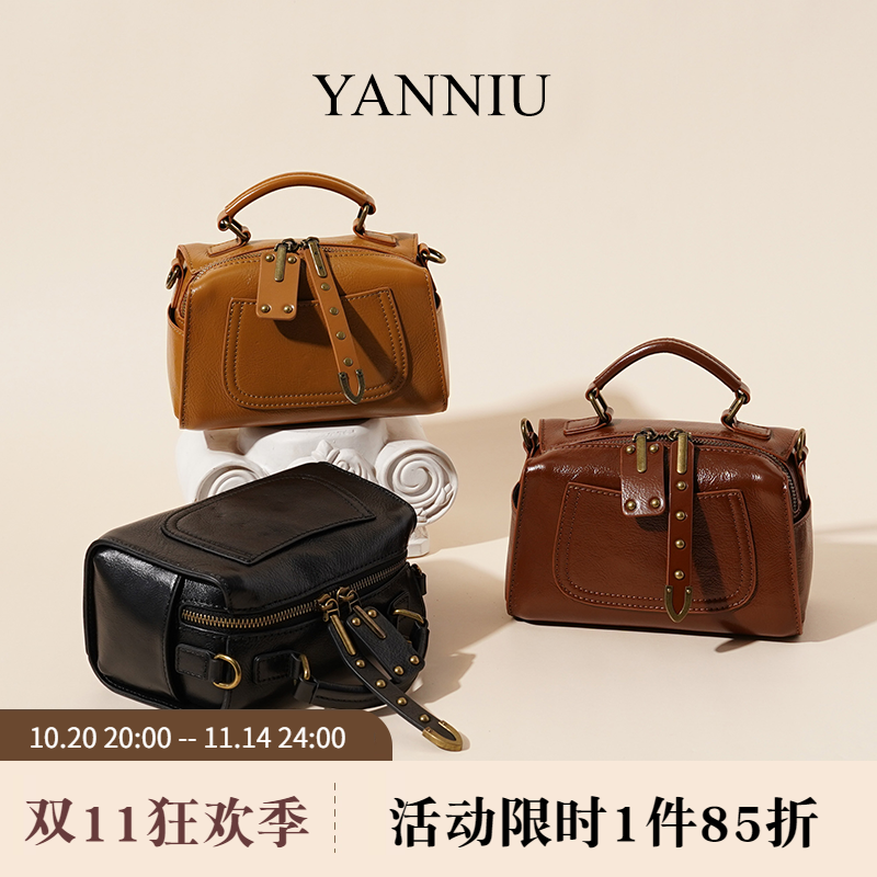 轻复古头层牛皮波士顿包简约女士单肩包手提包通勤斜挎枕头小包包